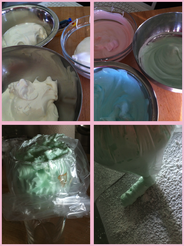 On va diviser la pâte dans 3 bols différents. Ajoutez le colorant alimentaire dans chaque bol (attention, une toute petite quantité suffit pour faire de jolie couleur pastel…) et battre de nouveau. Mettre immédiatement la guimauve dans une grande poche à douille munie d’une douille ronde.