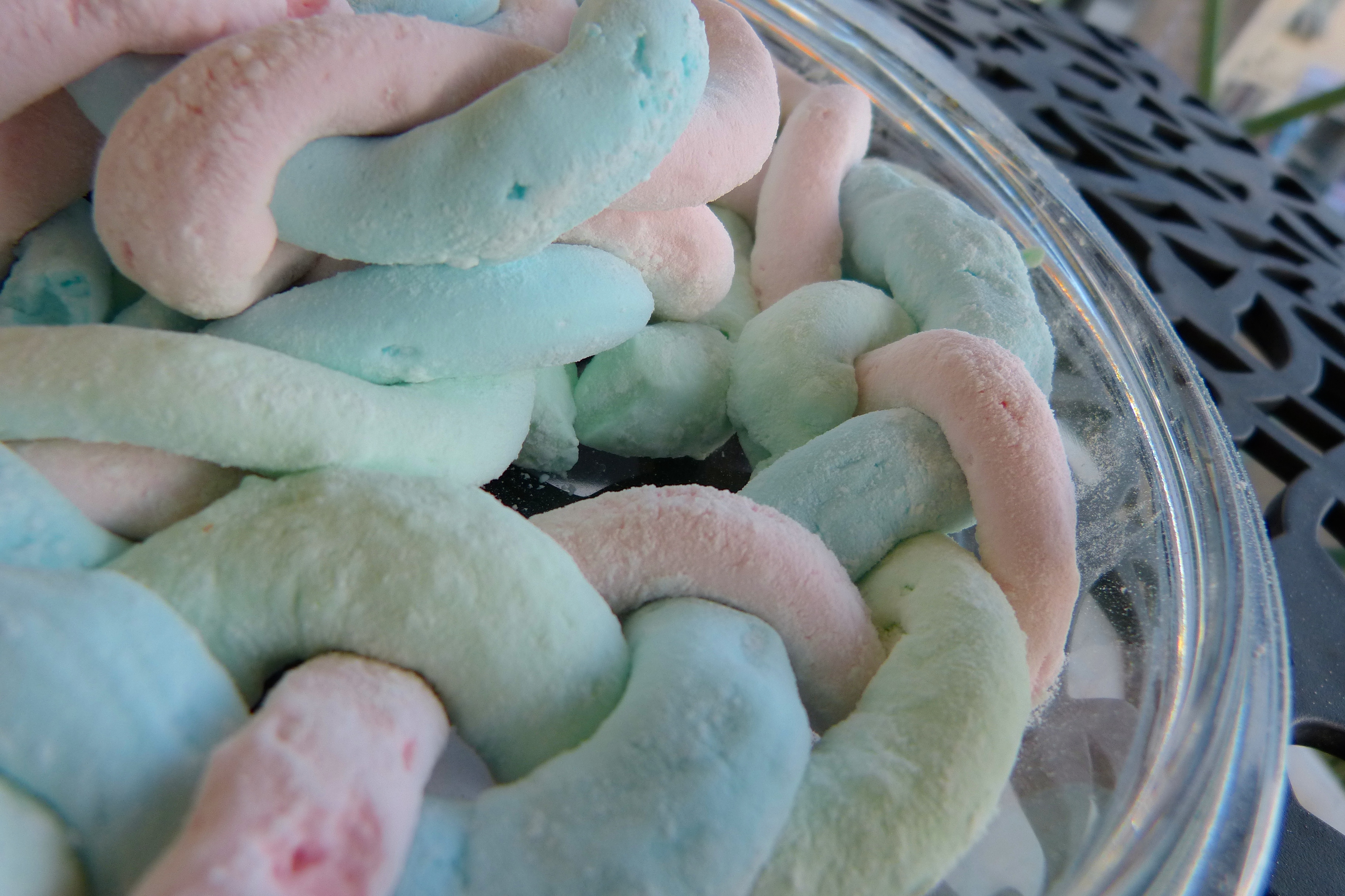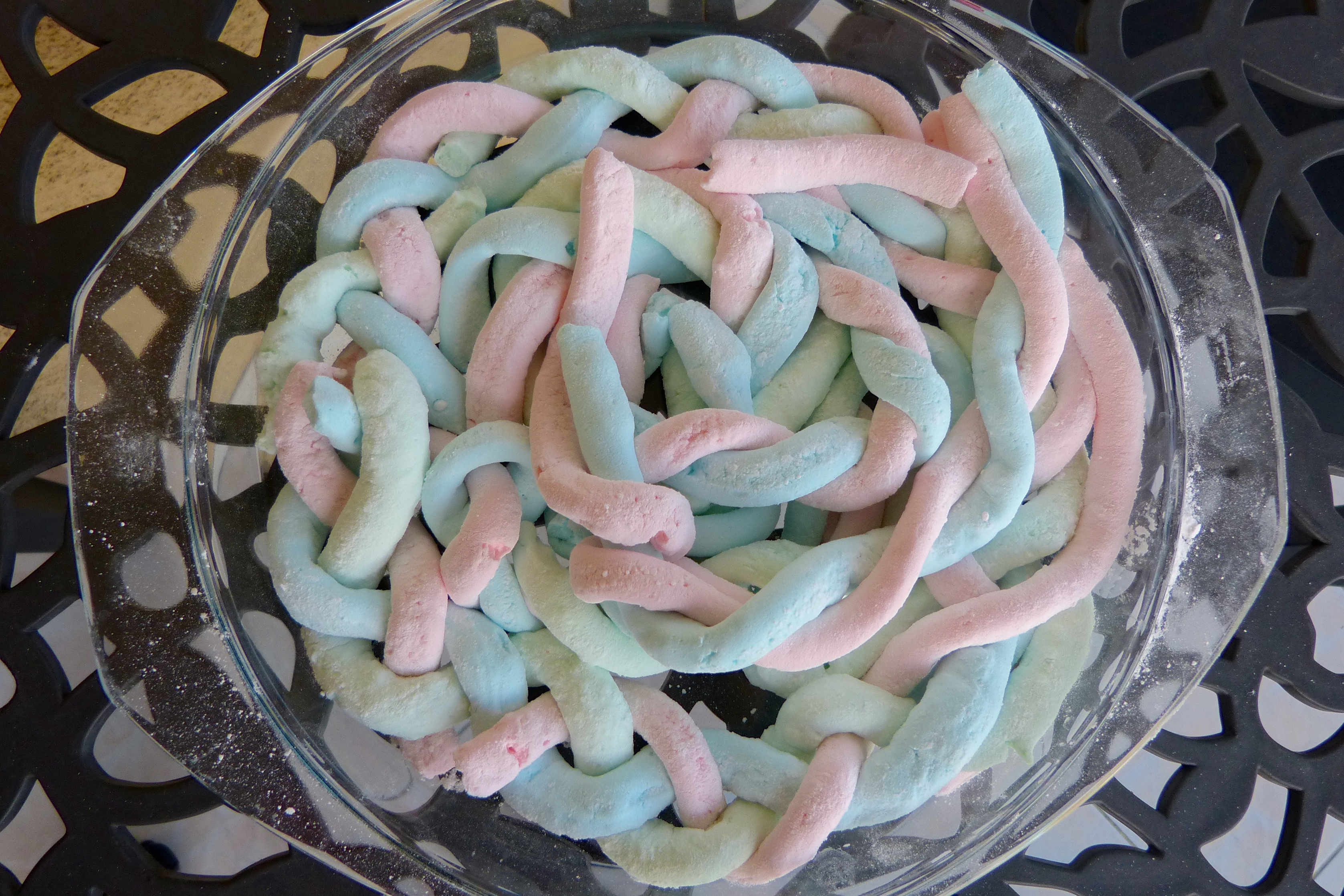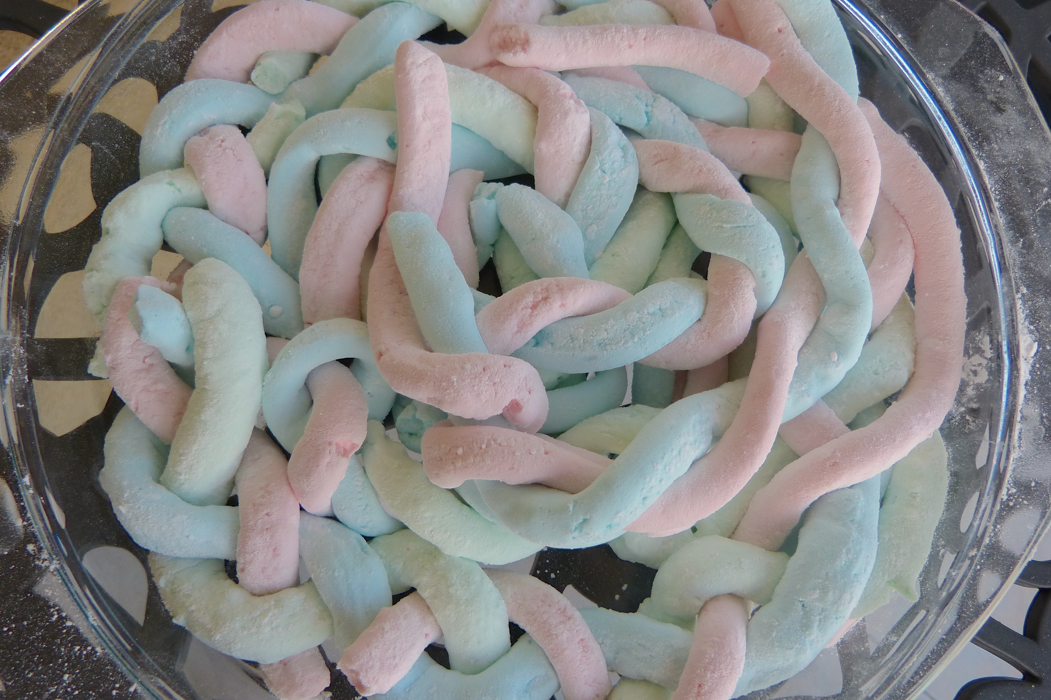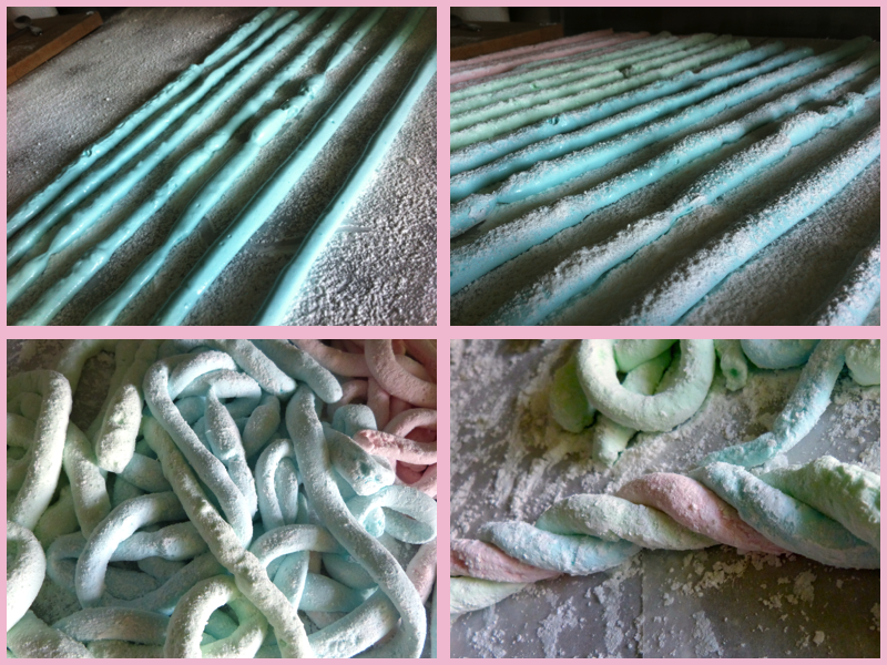 Décollez délicatement vos guimauves en saupoudrant encore d’enrobage. Vous pouvez enrouler ou tresser les cordes de guimauves entre elles à l’aide d’un cure dent pour former des jolies formes. Pour cela, disposez les trois couleurs de cordes côte à côte et piquez avec un cure-dent aux extrémités. Tordre les cordes ensemble et embrocher avec un autre cure-dent l’autre extrémité. Répétez le processus avec les cordes restantes. Les cordes peuvent être dégustés immédiatement mais ils ne tiendront pas leur forme. Laissez sécher encore 2H à 3H ou toute la nuit…mais tiendrez-vous tout ce temps ???!! moi non….