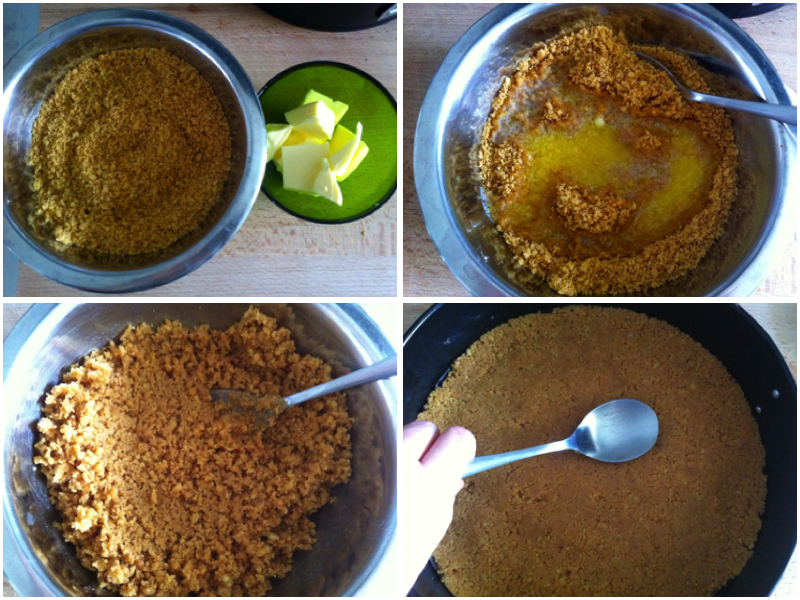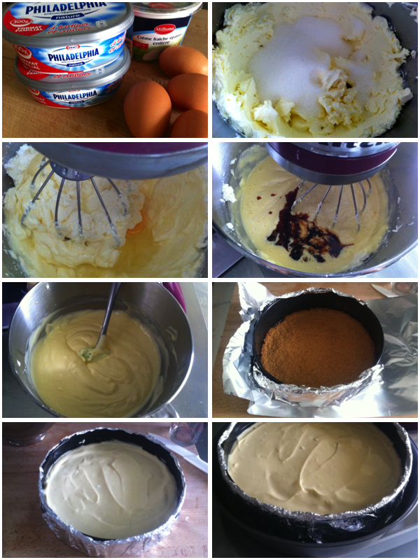 La recette traditionnelle a une couche de génoise « sponge cake » pour base, qui est ultra fine mais je ne suis pas vraiment fan de la génoise dans les cheesecakes.Je préfère largement la couche biscuitée aux Grahams Crackers.