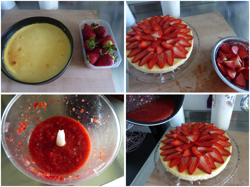 Avec les restes de fraise, préparez un coulis : mixez-les avec un peu de sucre en poudre. Faites chauffer votre coulis. Incorporez la feuille gelatine essorée, mélangez. Quand le coulis est refroidi, le verser sur le cheesecake.
