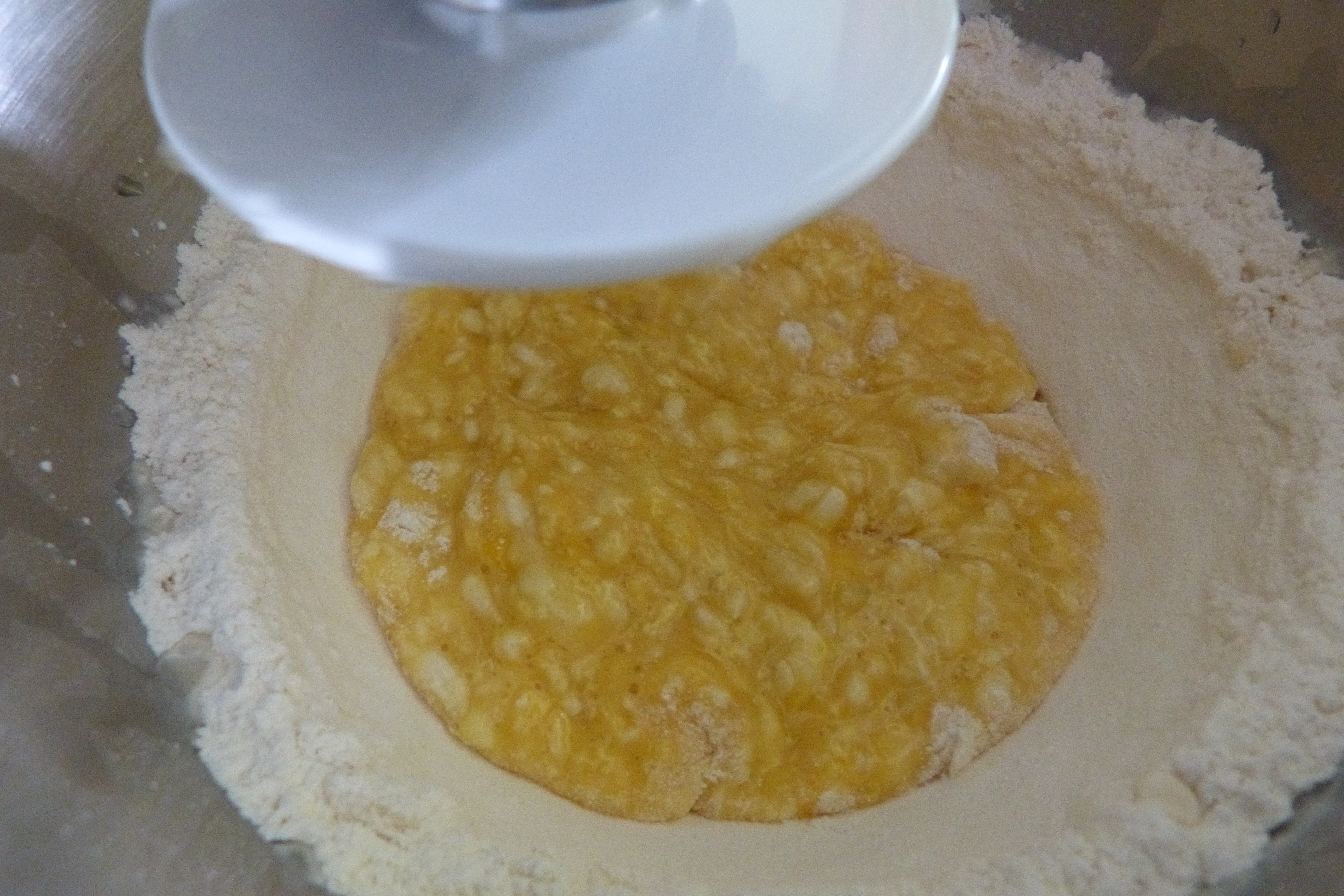 Dans un grand saladier (ou au robot avec le crochet pétrisseur), verser la farine et former un puits au centre duquel vous cassez les œufs.