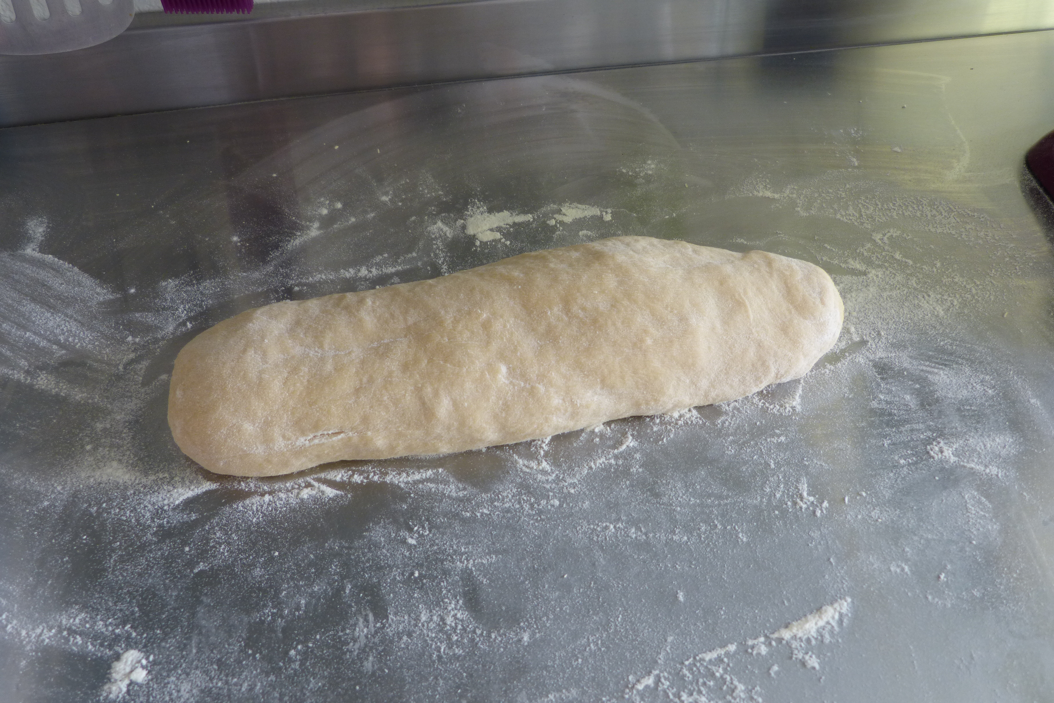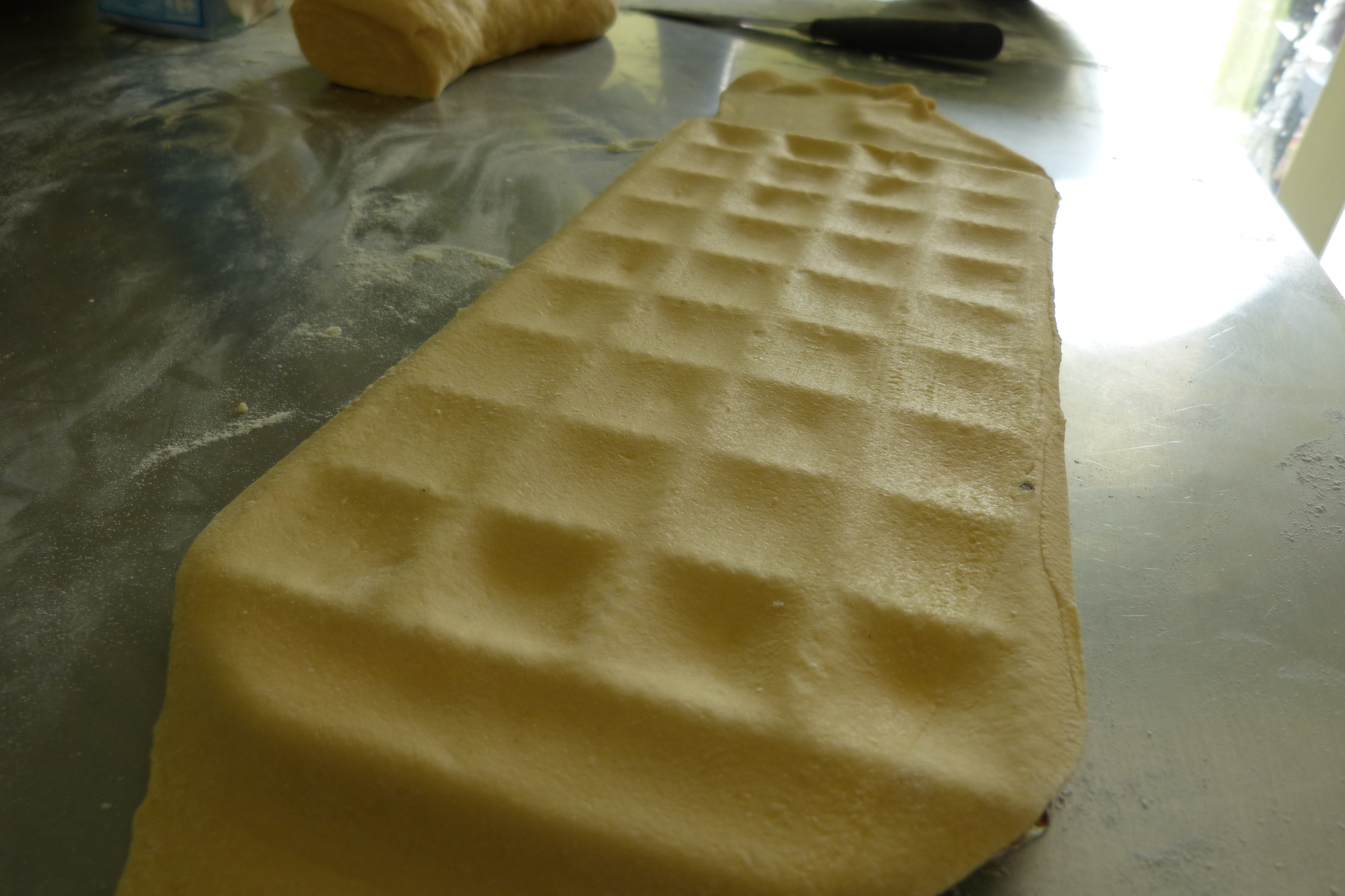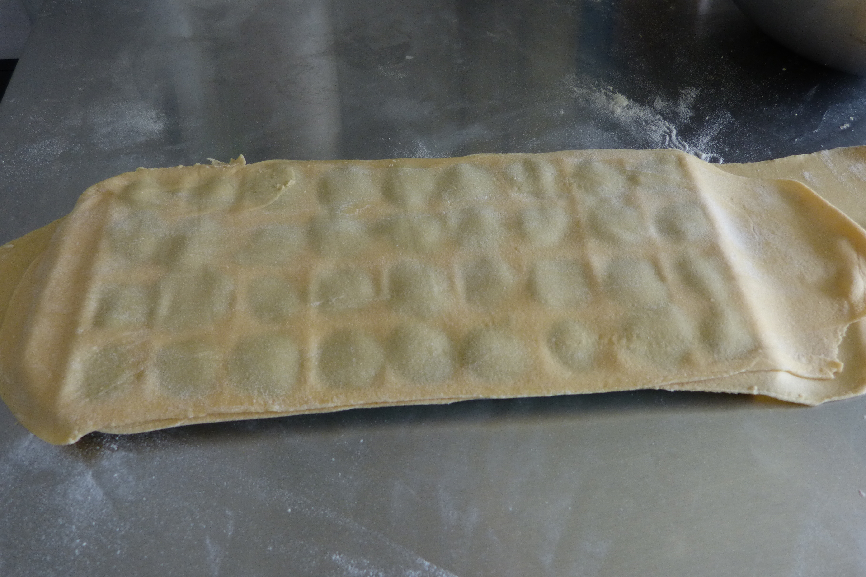 Les feuilles doivent être fines, assez longues et larges. D’abord, travailler la pâte sur 1 puis passer la pâte à 6 (pour mon laminoir..) Bien fariner les feuilles à chaque fois, c’est très important !