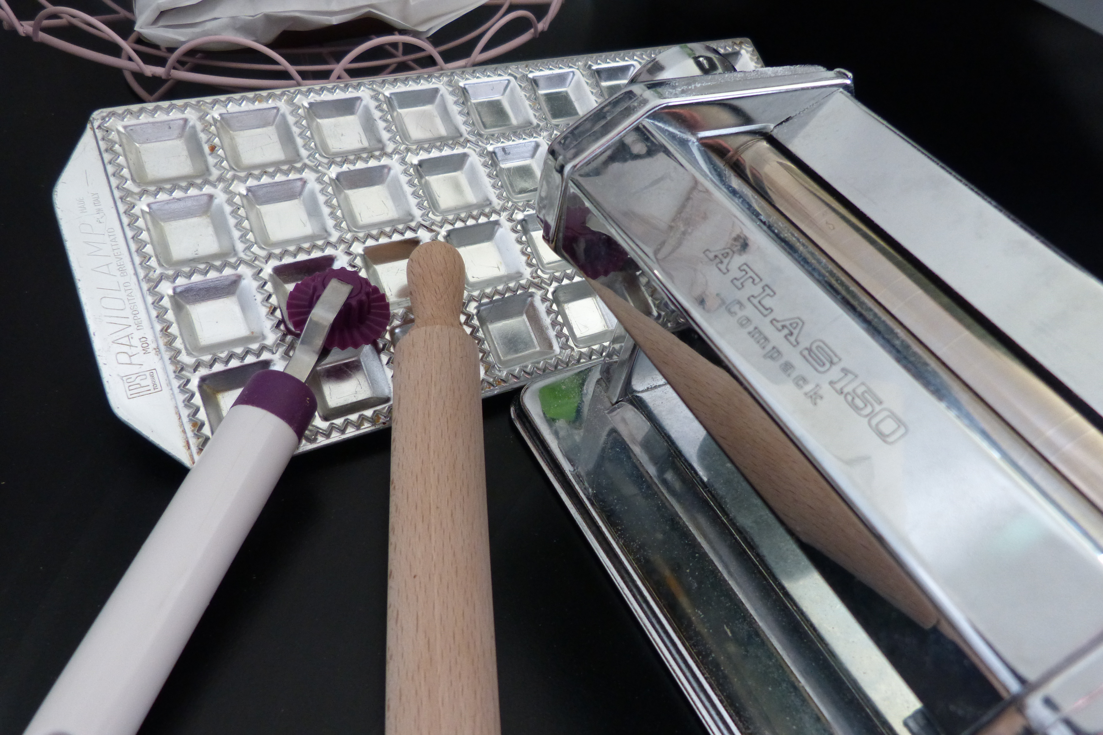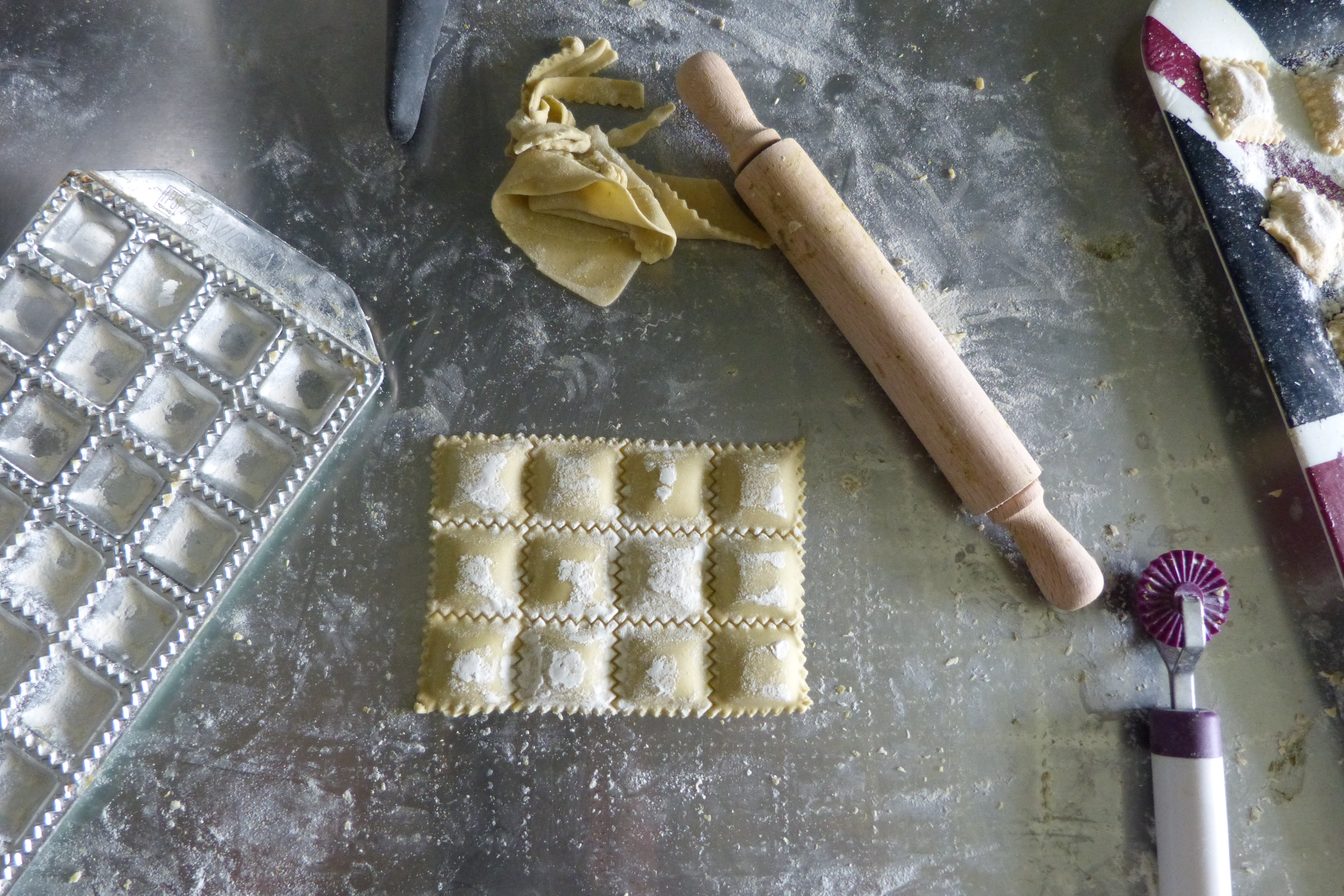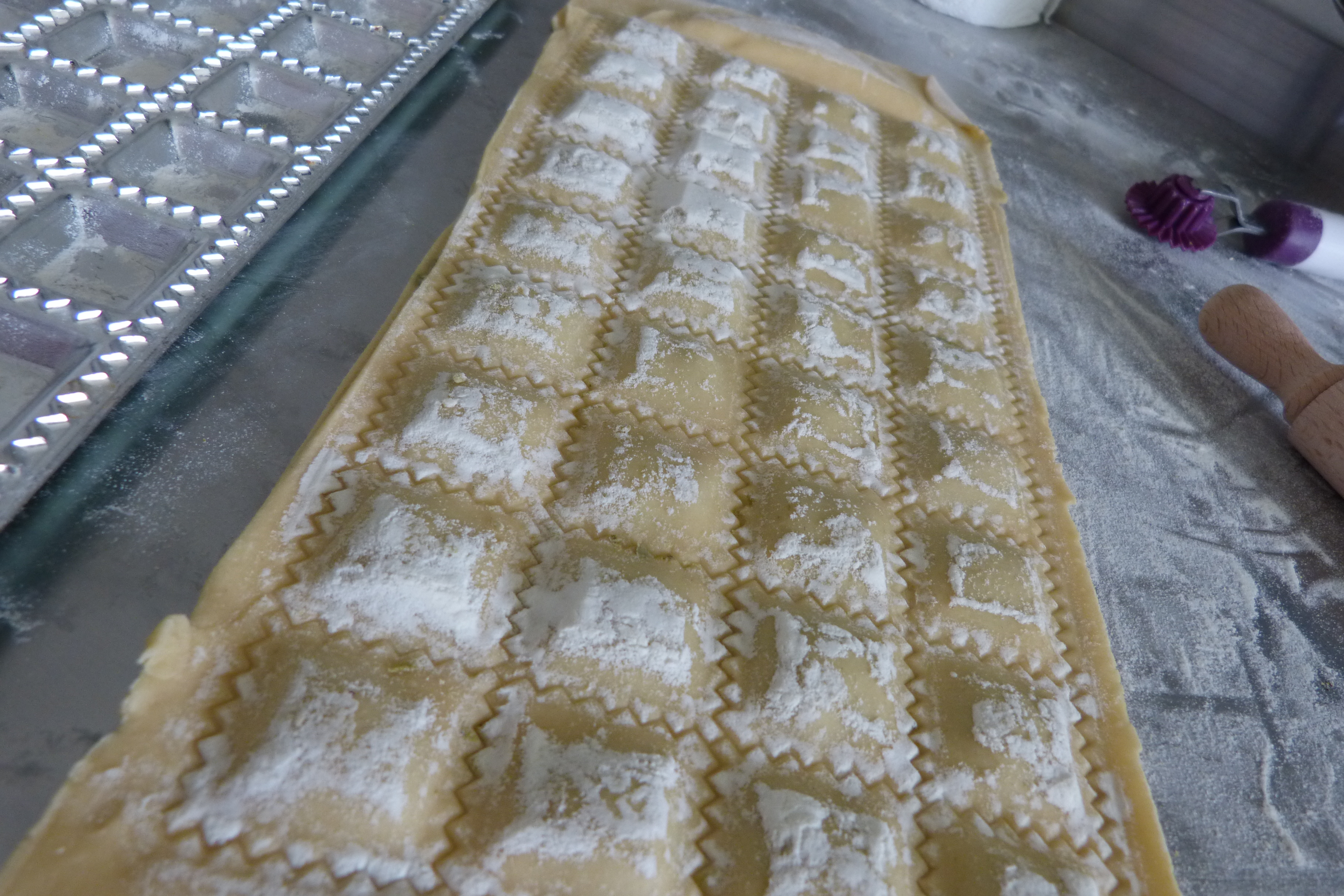 Je vous propose une autre recette de raviolis avec cette fois-ci une farce Ricotta-épinard. J’ai utilisé un moule à raviolis avec des alvéoles plus petites. D’habitude, je préfère les gros raviolis car on sent mieux la farce quand on croque dedans. Mais j’avoue que je voulais absolument tester la plaque que ma grand-mère m’a offert. Elle est très vieilles et elle est dans la famille depuis très longtemps. C’est un objet qui m’a toujours fasciné étant petite. Cette plaque est un peu plus difficile à manier car plus les raviolis sont petits, plus le démoulage est une sacrée histoire… Il ne faut pas hésiter à fariner la plaque généreusement à chaque tournées sinon c’est le drame…